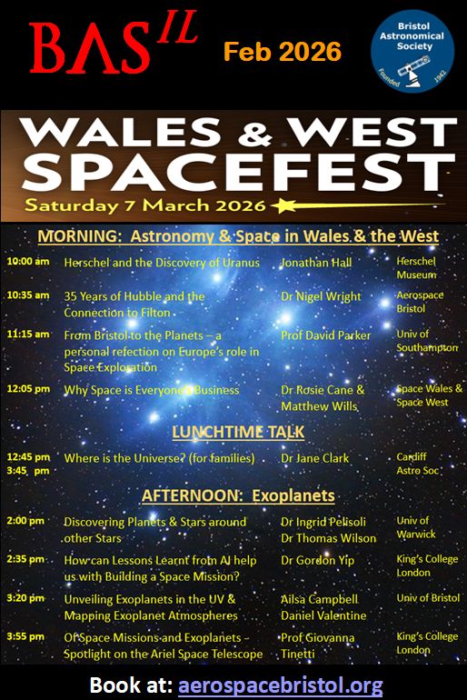 The front cover shows the programme of talks for the 'Wales & West Spacefest', which will be held at Aerospace Bristol on 7 March 2026. The event is being organised by the Bath Astronomers, Bristol Astronomical Society, Cardiff Astronomical Society and Aerospace Bristol, with our Special Events Coordinator, John Henn, leading the team. The morning session covers 'Astronomy and Space in Wales and the West' and the afternoon session has the theme of 'Exoplanets' with presentations from professional astrophysicists at the cutting edge of exoplanet research. It'll be a great day and please see the booking link at the bottom of the page for more information.