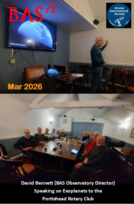 The front cover shows David Bennett (BAS Observatory Director) giving a talk on the theme of exoplanets to the Portishead Rotary Club (see p28 for more info.)